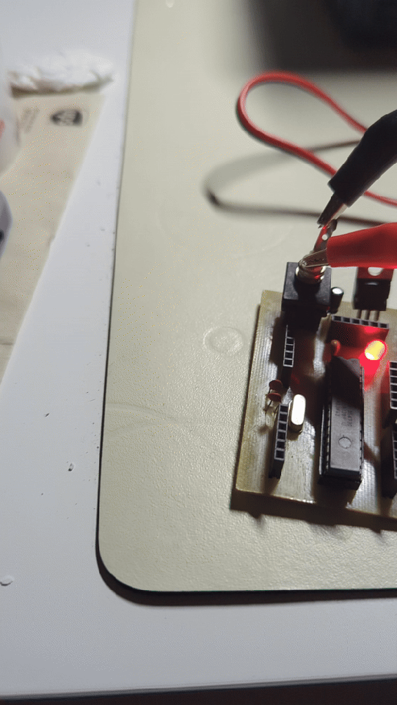 I built the assembly according to tutorials I found online. It was relatively straightforward, and after flashing it using a UART serial adapter, I had my Arduino Uno on a breadboard. I confirmed its functionality by uploading the ‘Blink’ sketch to the build from the Arduino IDE.