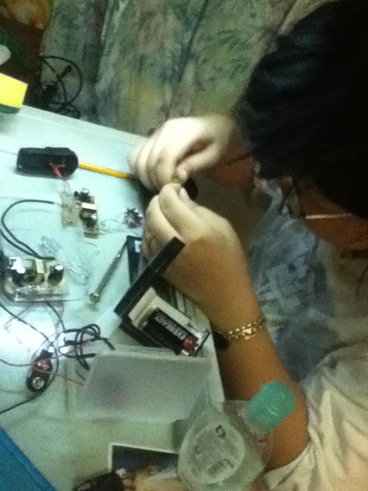 After gathering all the components and soldering them together with a technique I later learned is called ‘dead bug,’ I shoved it all in the box and attached the battery.