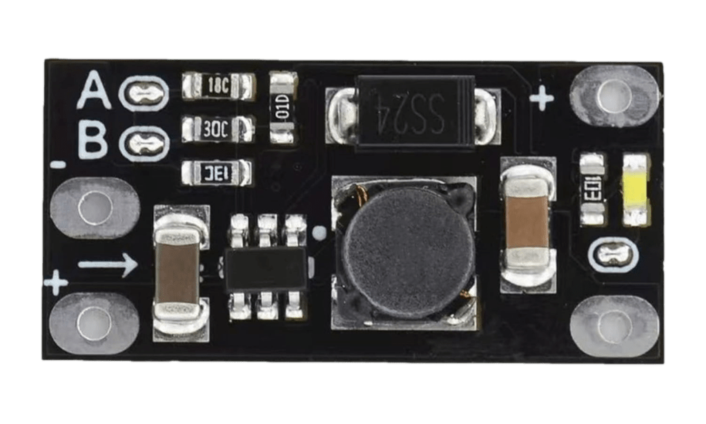 A boost converter to elevate the battery’s 7.4V output into a consistent 9V output.